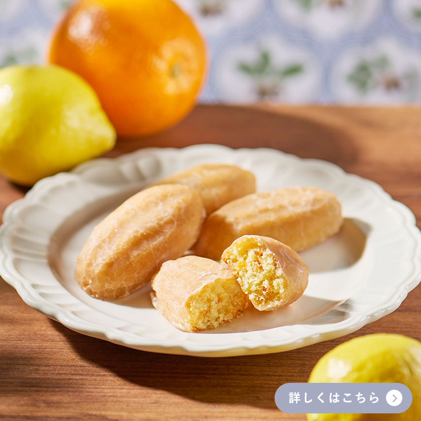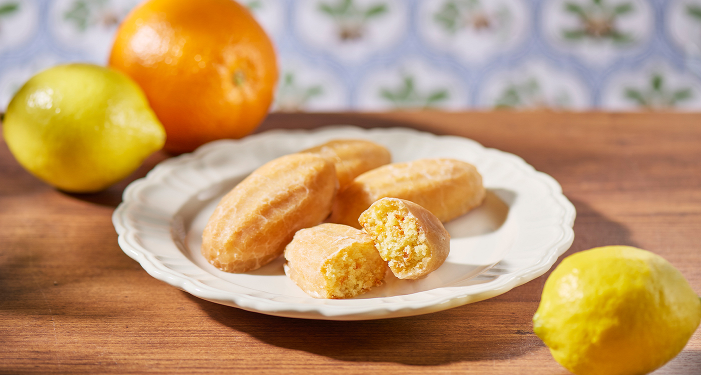 「レモンとオレンジ」アーモンドの風味豊かな生地にレモンとオレンジのピールを混ぜ込み、 ふっくらと焼き上げたマドレーヌに、レモン風味のグラサージュをまとわせました。