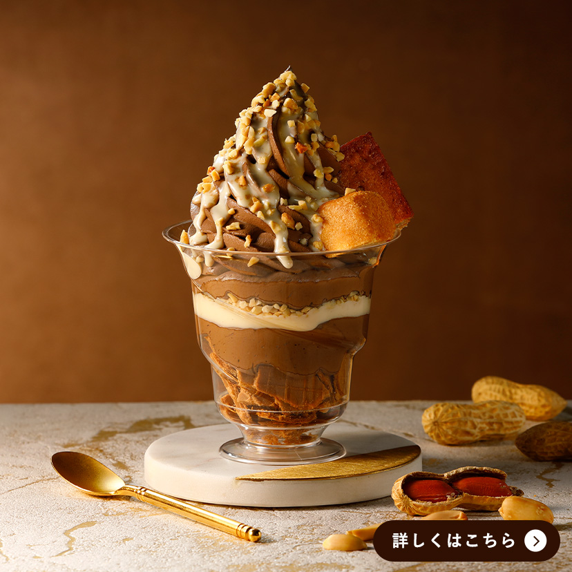 ミルク味のソフトクリームにピーナッツショコラをあしらい、ピーナッツのダイスを散りばめました。
