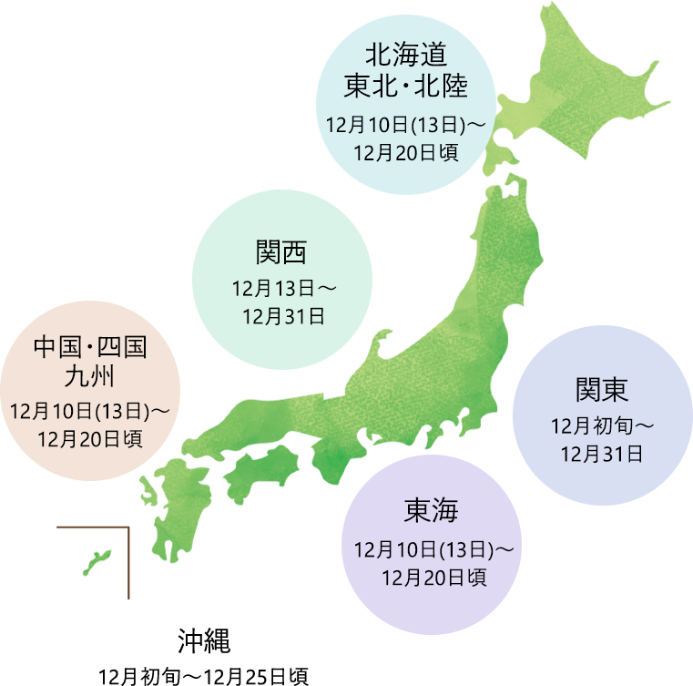 関西では、関東よりも若干時期が狭まり、12月13日〜12月31日までに届けることが一般的です。