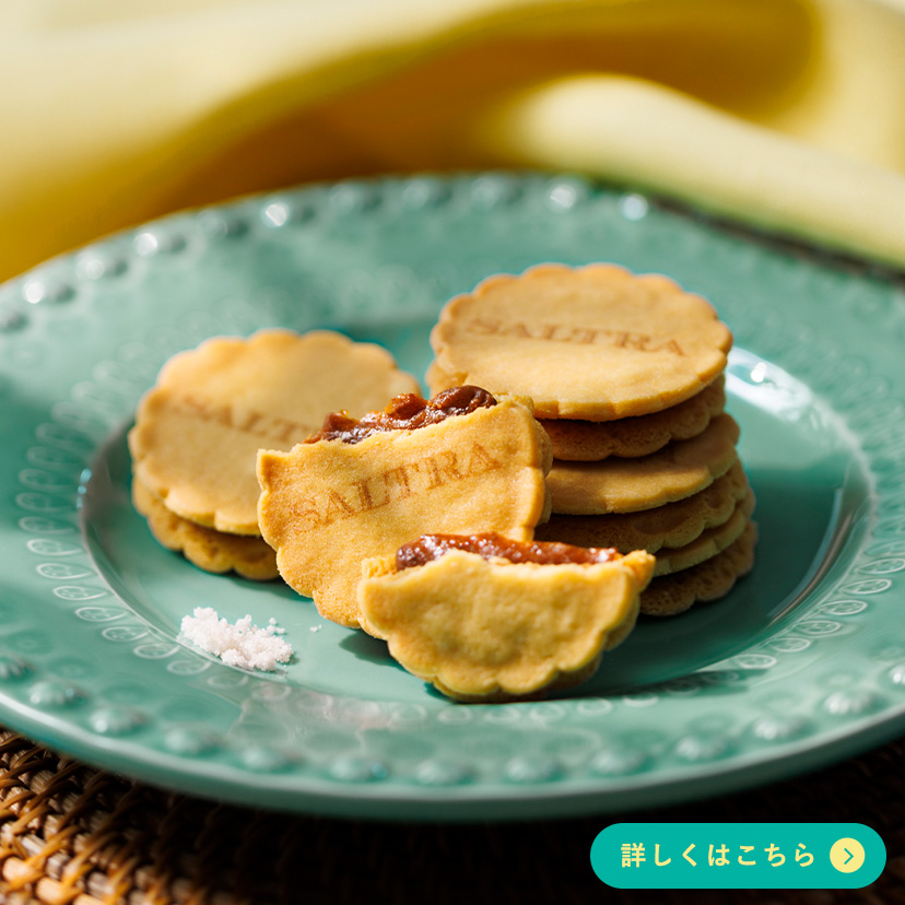 淡路島の藻塩を加えて炊き上げた自家製の塩キャラメルを、グラスフェッドバターを練り込み焼き上げた塩バタークッキーでサンドした、キャラメルサンドクッキー。