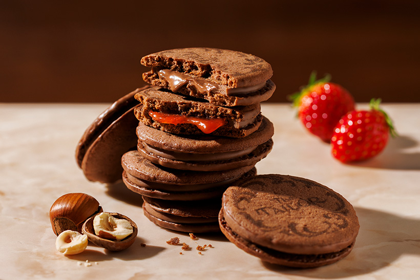 2種のソースをそれぞれフランス製のミルクチョコレートで包み込み、サクッと焼き上げたココアクッキーでサンドしました。香ばしいヘーゼルナッツクリームと甘酸っぱいストロベリーソースの2つの味わいが贅沢に味わえるアソートです。