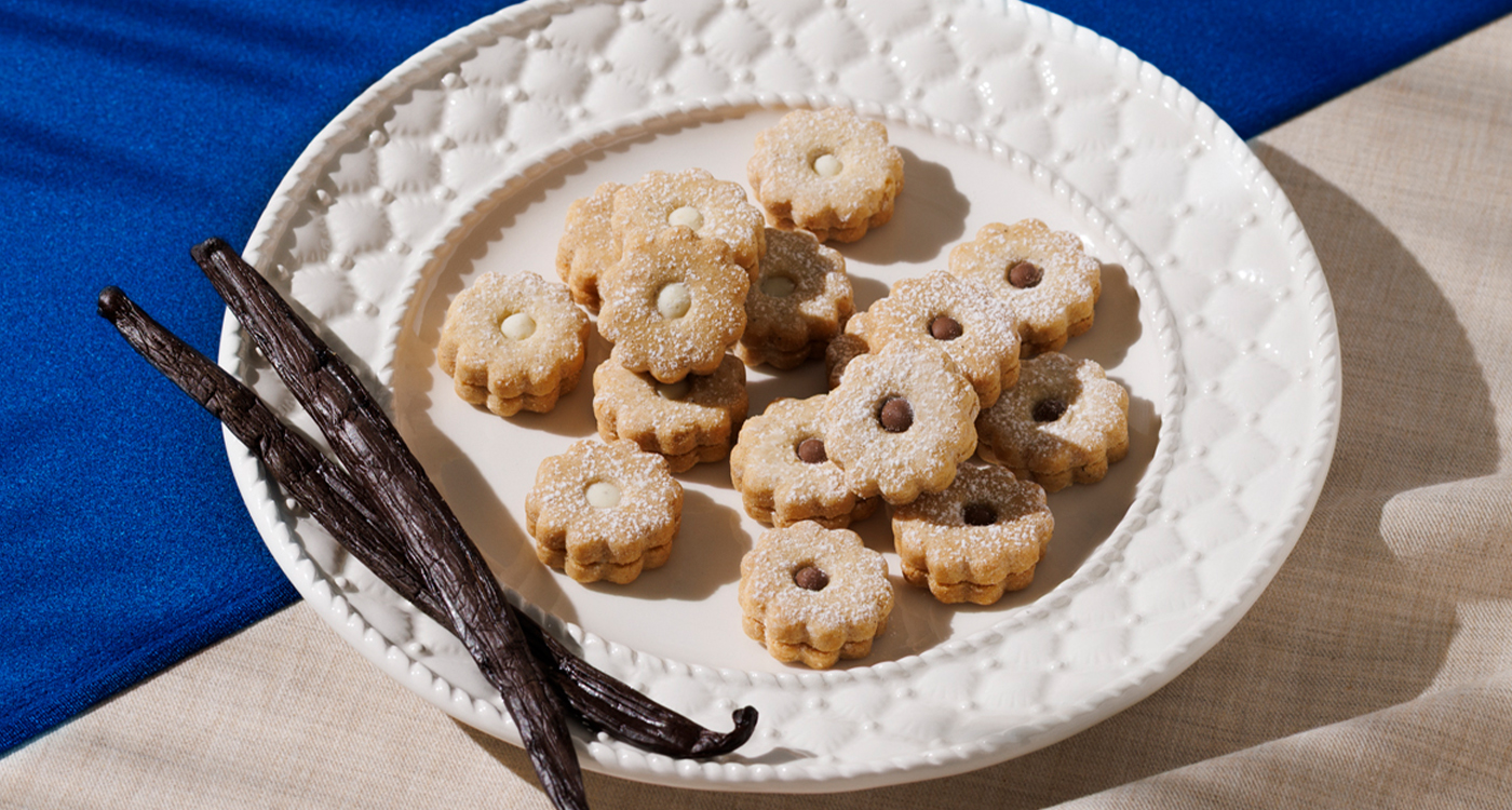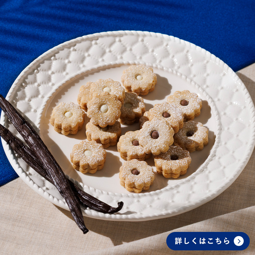 小さな花のかたちに模ったタヒチ産バニラを練り込んだ可憐なサブレに、バニラホワイトチョコとバニラミルクチョコをひとつひとつ丁寧に絞り、サンドしました。